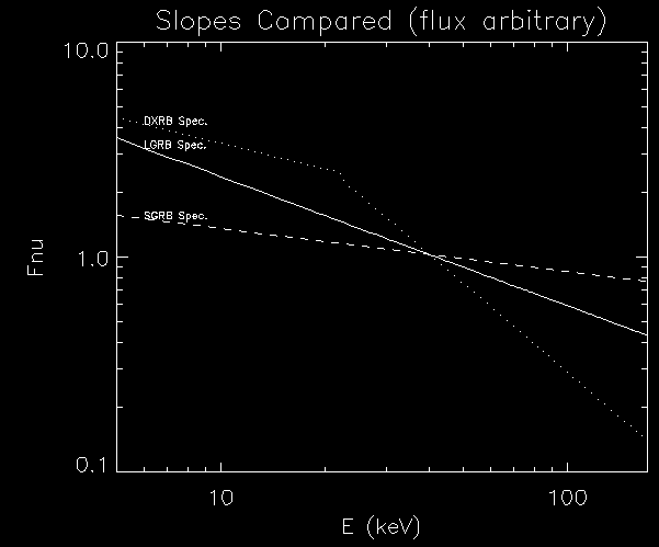 So, the DXRB is almost as hard as SGRB up to ~ 25 keV, then it is very steep. Now let's see that in Counts space, which helps visualize results below. File:grbvdxrb_counts.png